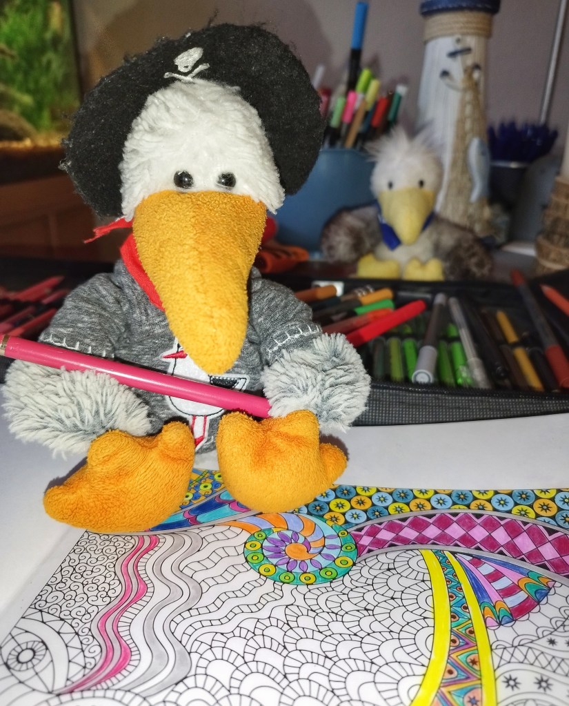Mir ist inzwischen zugetragen worden, dass Möwen… und erst recht Klabautermöwe… nie richtig erwachsen werden. Meine Menschin ist mir nicht böse, dass ich angefangen habe zu malen, da ich es wohl recht ordentlich gemacht habe – hat sie gesagt. Deswegen habe ich es mir in der Küche gemütlich gemacht und male noch ein bisschen weiter.