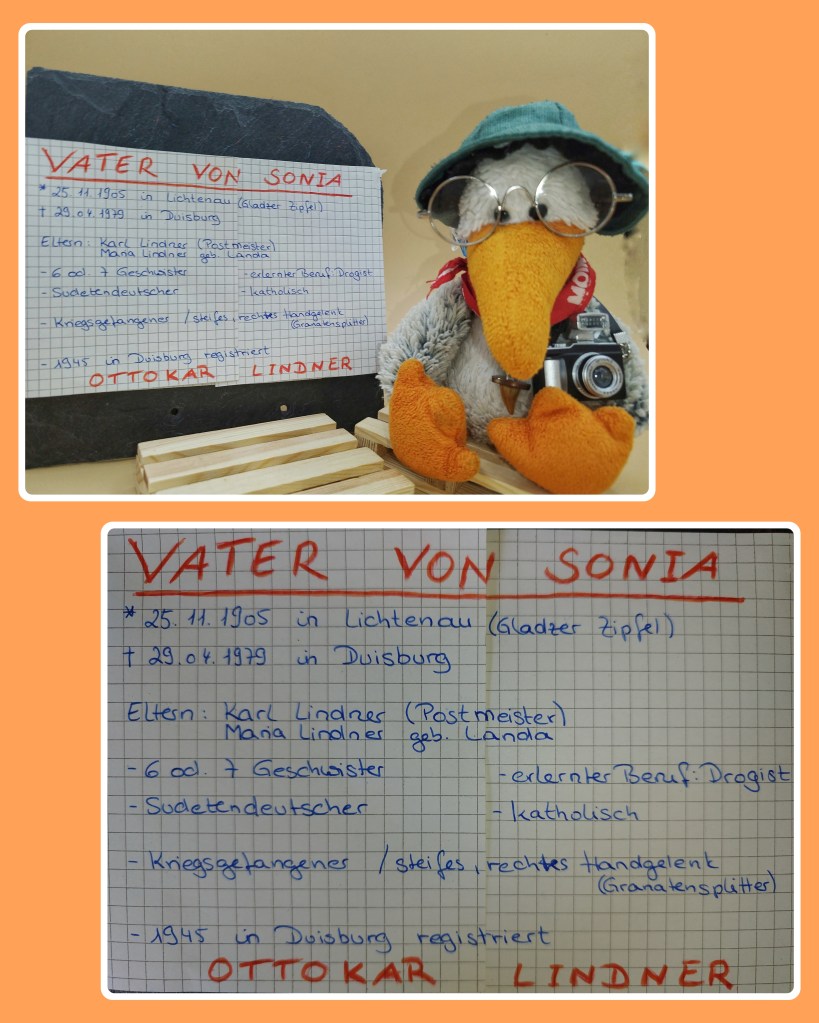 Ich war heute fleißig und habe nicht nur die Eckdaten der vermissten Halbtante zusammen getragen, sondern auch die wichtigsten Daten von Vater der Halbtante (was ja der Opa meiner Menschin ist). Über ihn haben wir sogar noch ein paar Infos mehr als auf dem Zettel stehen.