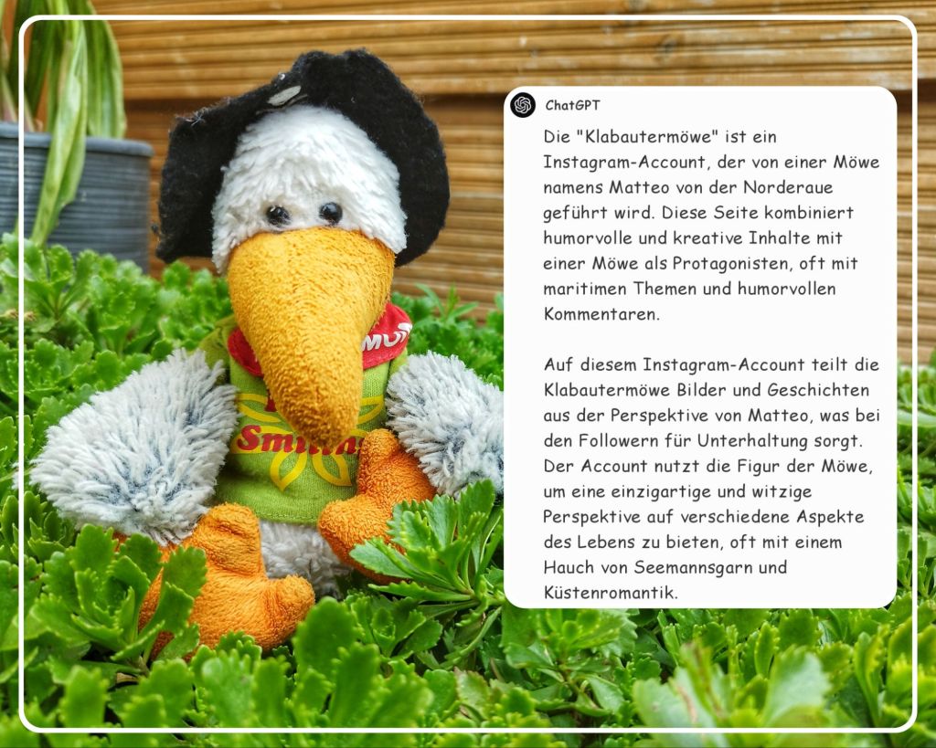 Ich bin ja eine neugierige Möwe, um genau zu sein eine neugierige Klabautermöwe… deswegen habe ich ChatGPT heruntergeladen und dort mal meinen Namen ღ∀⊥⊥εø ṽøη ∂εя ηøя∂εя∀ʊε eingegeben… erst erzählte das Ding etwas von einem Namen, aber es wisse nichts genaues oder so ähnlich… also habe ich noch „Klabautermöwe“ und „Instagram“ hinzugefügt… da kam dieser tolle Text über mich. Mir gefällt diese Beschreibung!