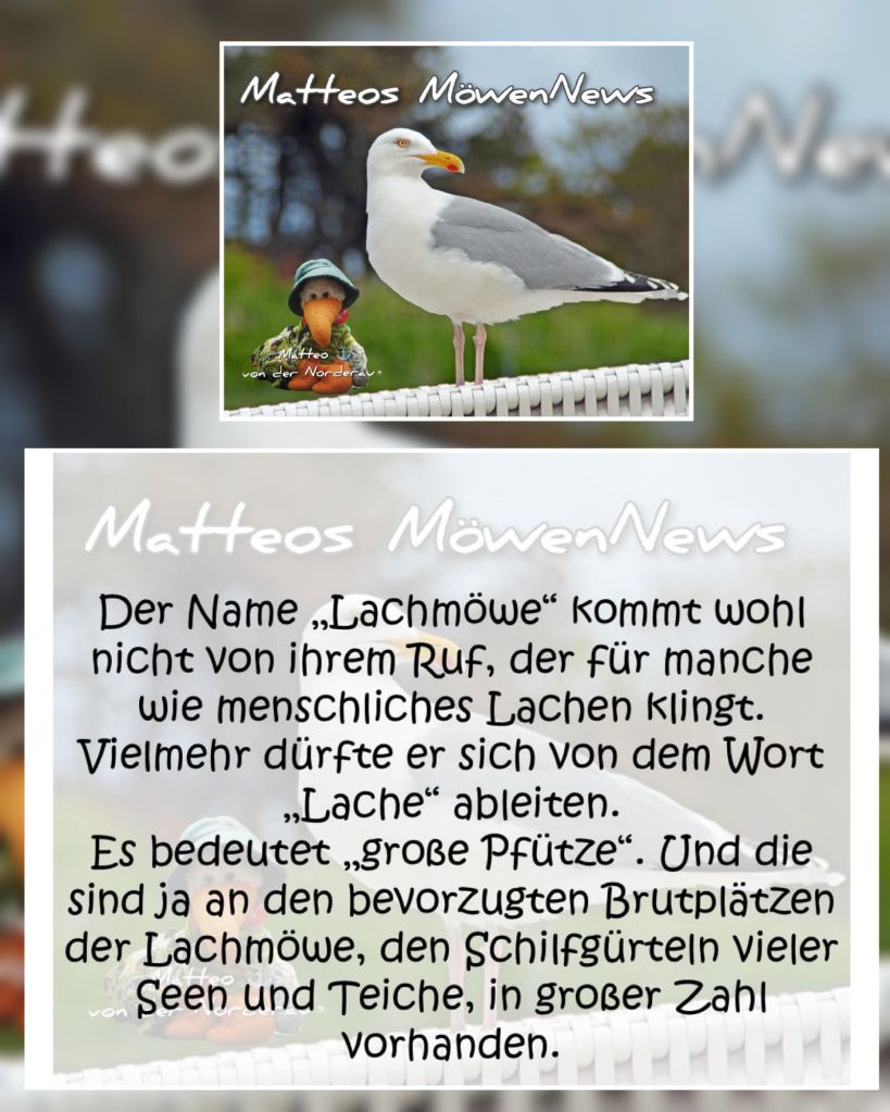 Vielmehr dürfte er sich von dem Wort „Lache“ ableiten. Es bedeutet „große Pfütze“ und die sind ja an den bevorzugten Brutplätzen der Lachmöwe, den Schilfgürteln vieler Seen und Teiche, in großer Zahl vorhanden.