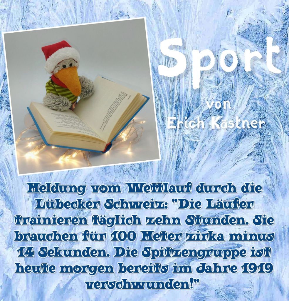 ⚓ Matteo liest Erich Kästner ⚓ Sport Meldung vom Wettlauf durch die Lübecker Schweiz: „Die Läufer trainieren täglich zehn Stunden. Sie brauchen für 100 Meter zirka minus 14 Sekunden. Die Spitzengruppe ist heute morgen bereits im Jahre 1919 verschwunden.“ ⚓