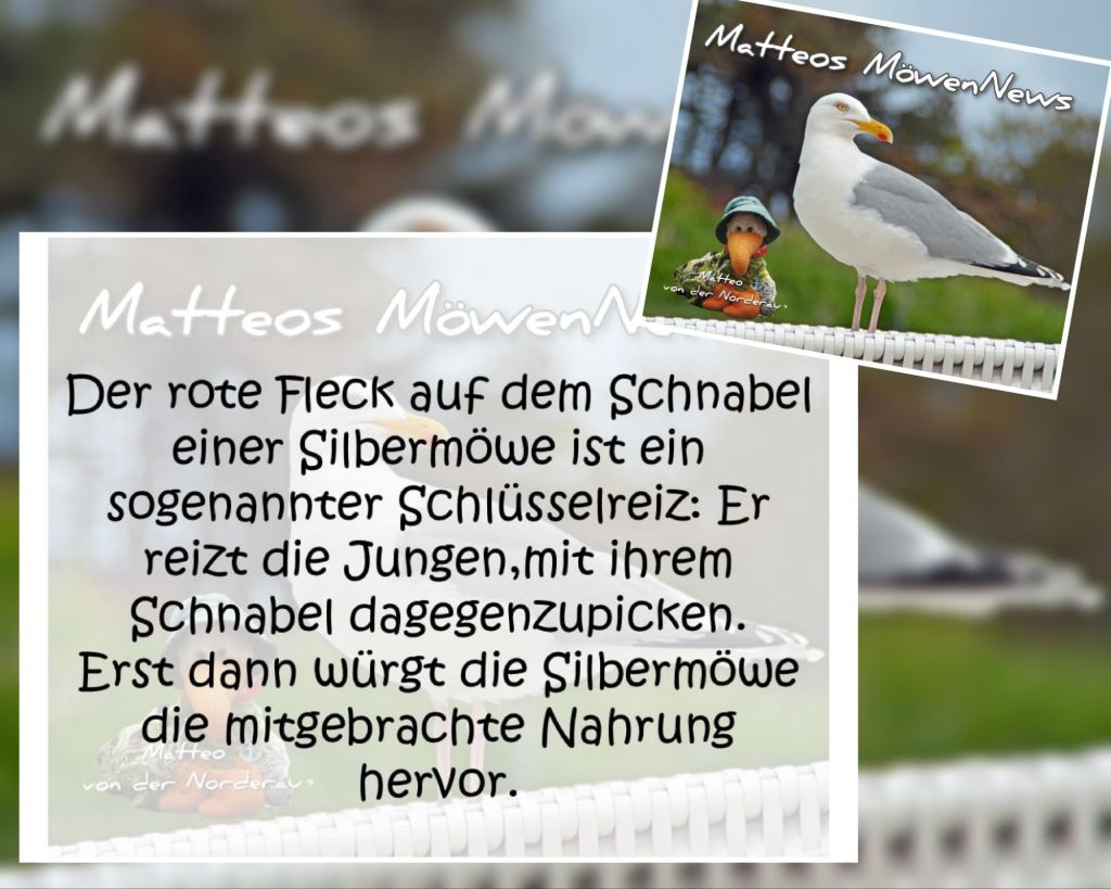 9. Dezember 2024 Conny B. MöwenNews – #8 Achtung ⚠️ Matteos MöwenNewsDer rote Fleck auf dem Schnabel einer Silbermöwe ist ein sogenannter Schlüsselreiz:Er reizt die Jungen, mit ihrem Schnabel dagegenzupicken.Erst dann würgt die Silbermöwe die mitgebrachte Nahrung hervor.⚓ Teilen mit: Auf X teilen (Wird in neuem Fenster geöffnet) X Auf Facebook teilen (Wird in neuem Fenster geöffnet) Facebook Gefällt mir Wird geladen … Ähnliche Beiträge