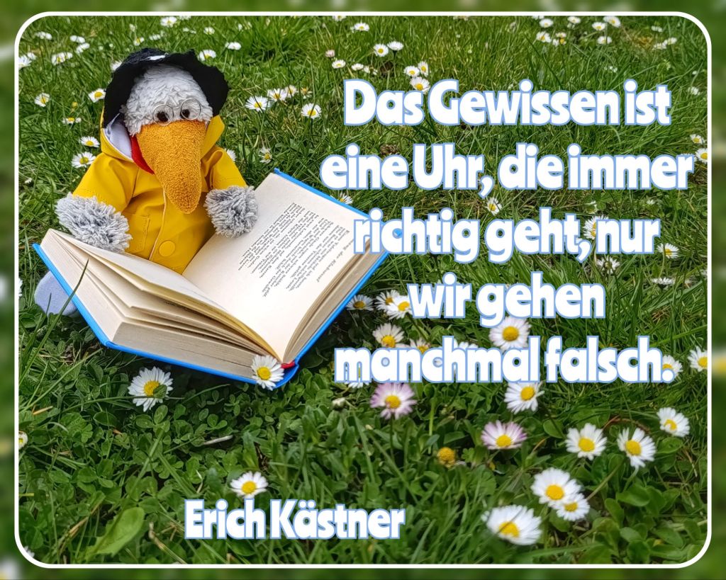11. April 2025 Conny B. Matteo liest – #3 ⚓ Matteo liest Erich Kästner ⚓Das Gewissen ist eine Uhr, die immer richtig geht, nur wir gehen manchmal falsch.⚓ Teilen mit: Auf X teilen (Wird in neuem Fenster geöffnet) X Auf Facebook teilen (Wird in neuem Fenster geöffnet) Facebook Gefällt mir Wird geladen … Ähnliche Beiträge