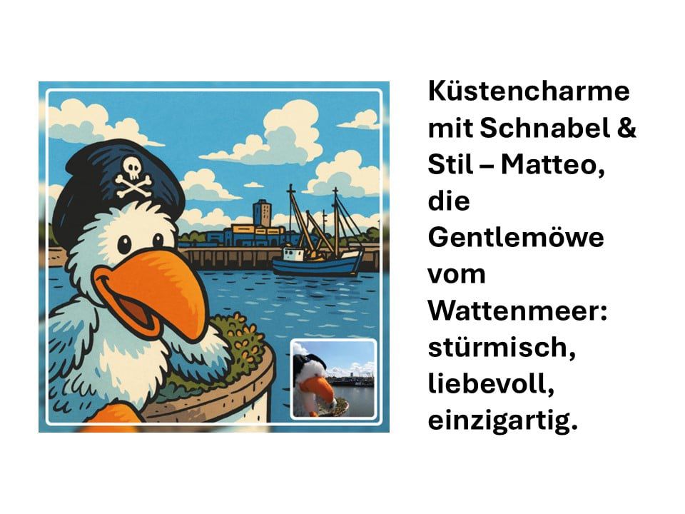 15. April 2025 Conny B. Beschreibung überarbeitet Was haltet ihr von der Variante, die würde auch in die Beschreibung passen:„Küstencharme mit Schnabel & Stil – Matteo, die Gentlemöwe vom Wattenmeer: stürmisch, liebevoll, einzigartig.“Es passt dann noch „Die Bilder sind mein Eigentum“ darunter.⚓ Teilen mit: Auf X teilen (Wird in neuem Fenster geöffnet) X Auf Facebook teilen (Wird in neuem Fenster geöffnet) Facebook Gefällt mir Wird geladen … Ähnliche Beiträge